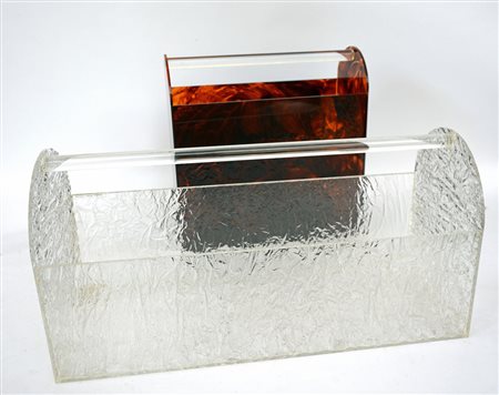 Lotto di due portariviste in plexiglass, uno trasparente con effetto crespato e l'altro color tartaruga (misure differenti) (lievi difetti)