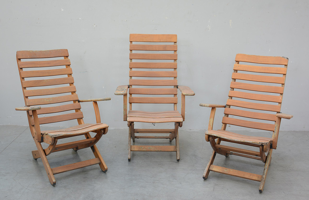 Gruppo di tre poltrone sdraio Foppapedretti con seduta a listelli (difetti)