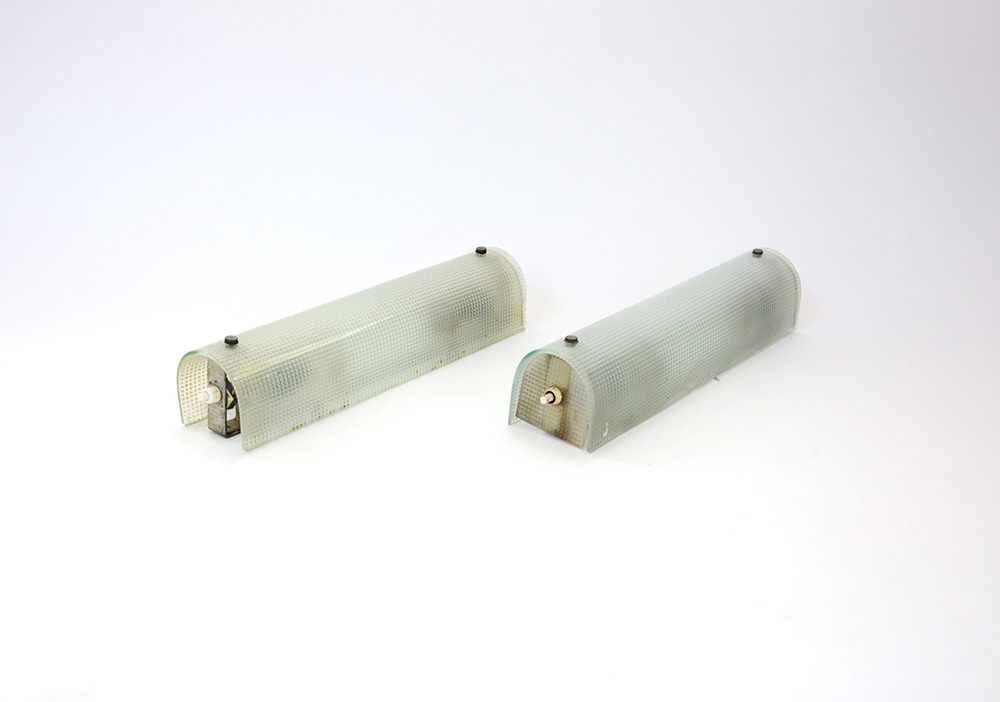 Coppia di lampade da parete in vetro stampato e metallo. Italia, anni 40 (l cm 33,5) (difetti e mancanze)