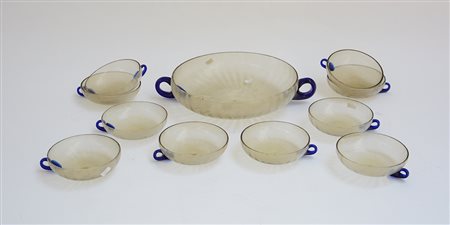 Manifattura di Murano Parte di servizio da macedonia in vetro pagliesco con anse blu (difetti)
