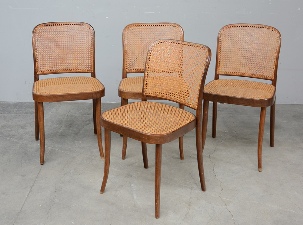 Gruppo di quattro sedie con struttura in faggio curvato, seduta e dorsale incannucciato (difetti) Produzione Ligna, Cecoslovacchia. Anni '90, sec. XX