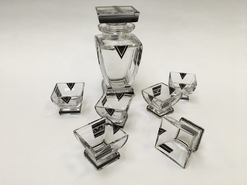Manifattura centro-europea. Bottiglia e sei bicchieri in cristallo molato, decorato con motivi di gusto decò. Sec XX (lievi difetti)