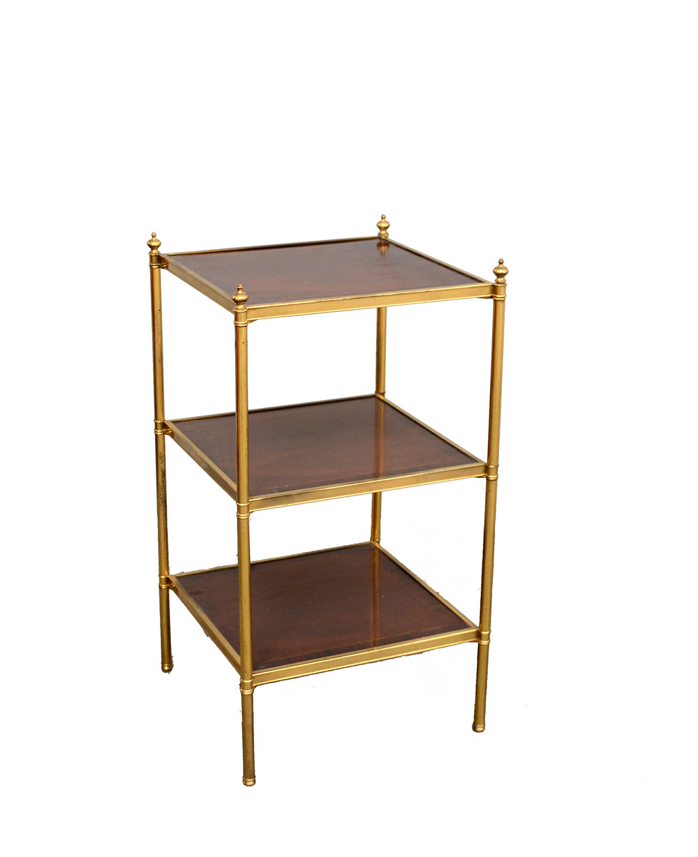 Etagère a tre ripiani di forma quadrata con montanti e profili in metallo dorato (cm 43x80x42) (lievi difetti)