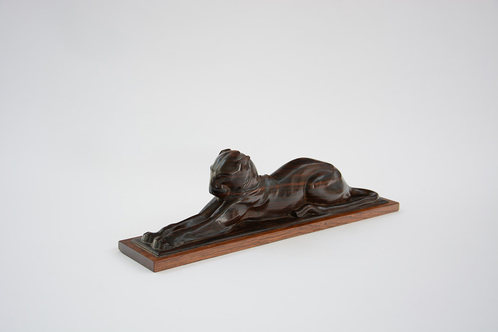 Ignoto "Tigre". Scultura decò in legno massello poggiante su base in legno impiallacciato. Anni 30 (cm 49x15) (difetti)
