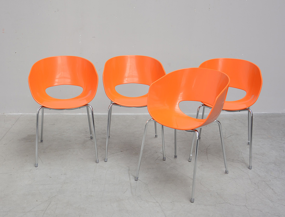 Robby Cantarutti e Francesca Petrichich Lotto composto da quattro poltroncine arancio modello "Orbit". Produzione recente Sintesi. Tecnopolimero standard, tubo d'acciaio (cm 57x81x48)