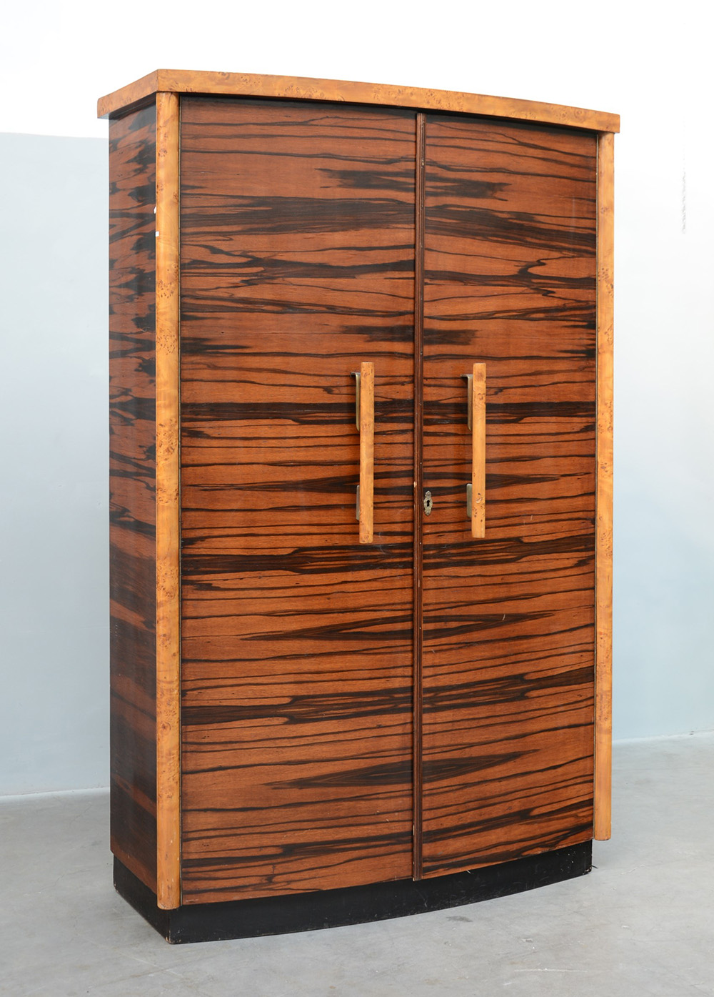 Armadio déco lastronato in radica a due ante curve sul fronte con manigliee montanti torniti. Italia, anni 30 (cm 132x200x49)(difetti)