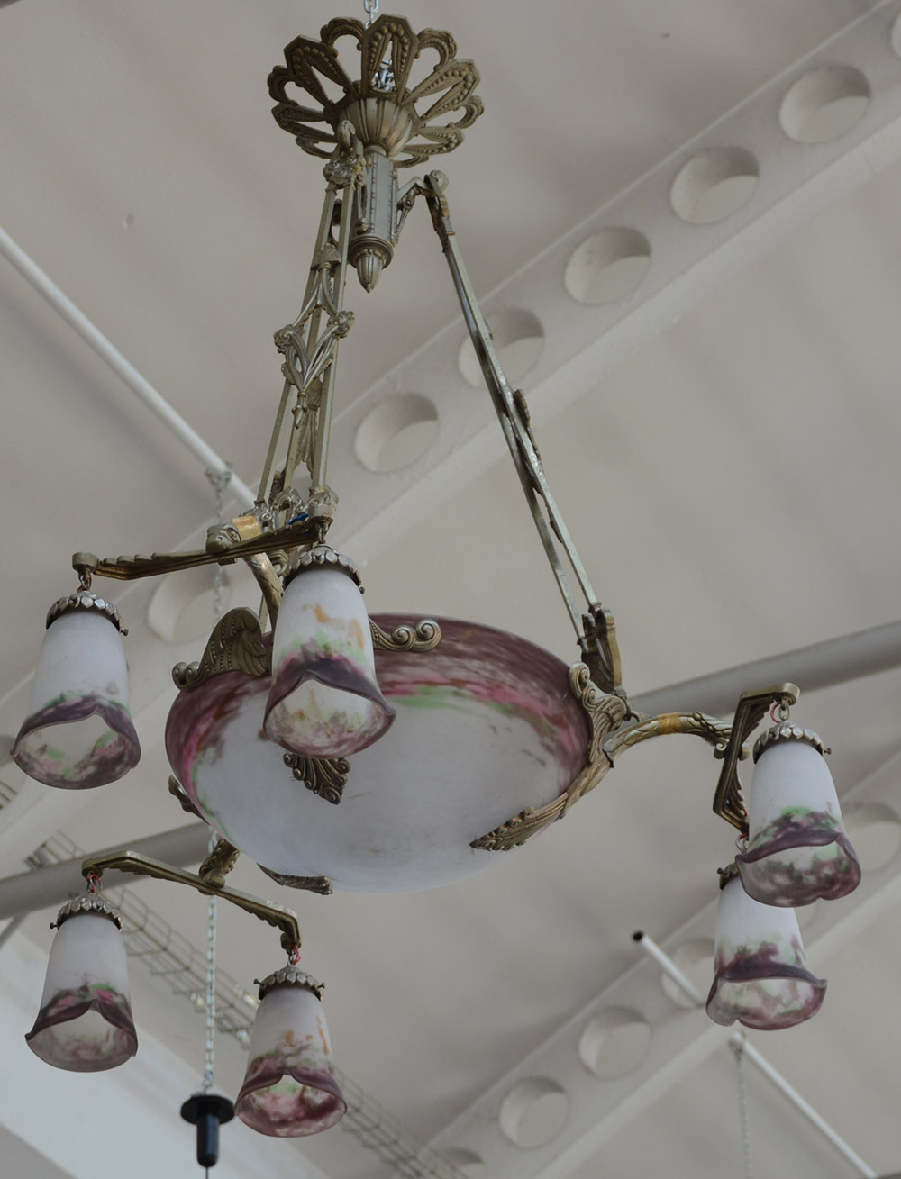 Lampadario a cesendello con struttura in fusione metallica di forme decò, coppa centrale e paralumi in vetro bianco, rosa, verde e ametista. Prima metà del sec XX (difetti)