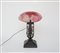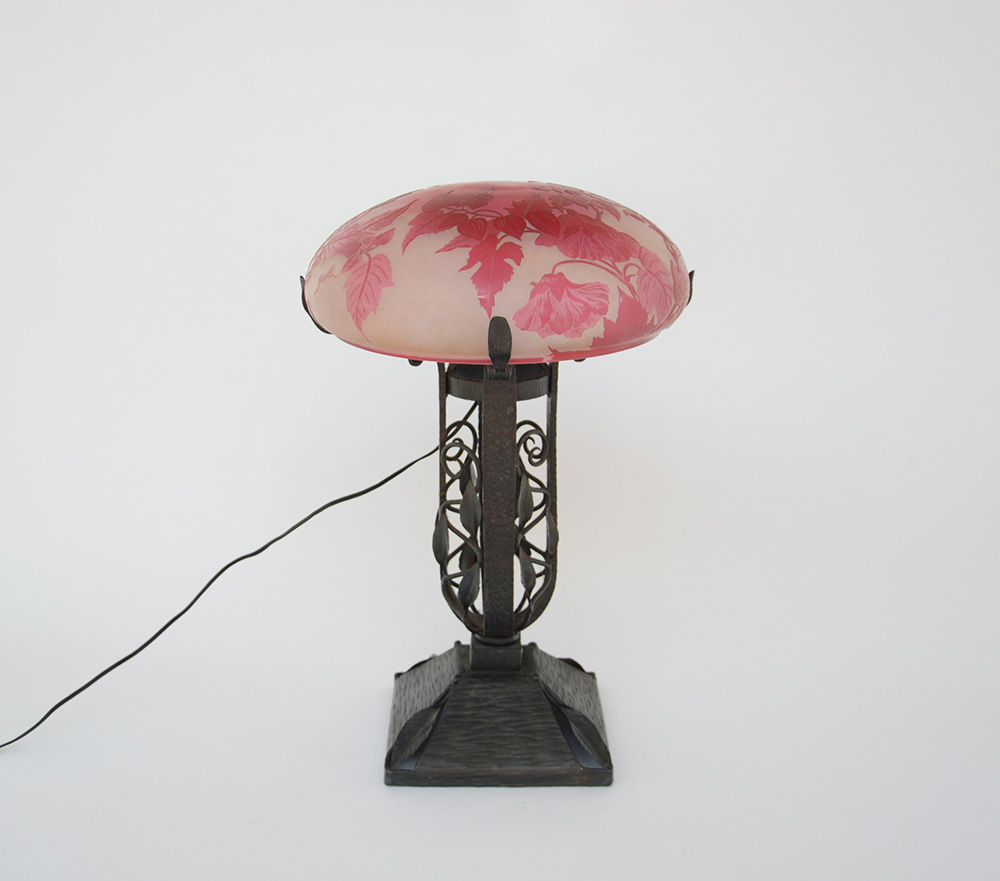 Lampada con struttura in ferro battuto e diffusore in vetro a cammeo inciso all’acido nei toni vinaccia e ghiaccio. Sec XX. Firma "Gallé" (d cm 29, h cm 45) (lievi difetti al diffusore)