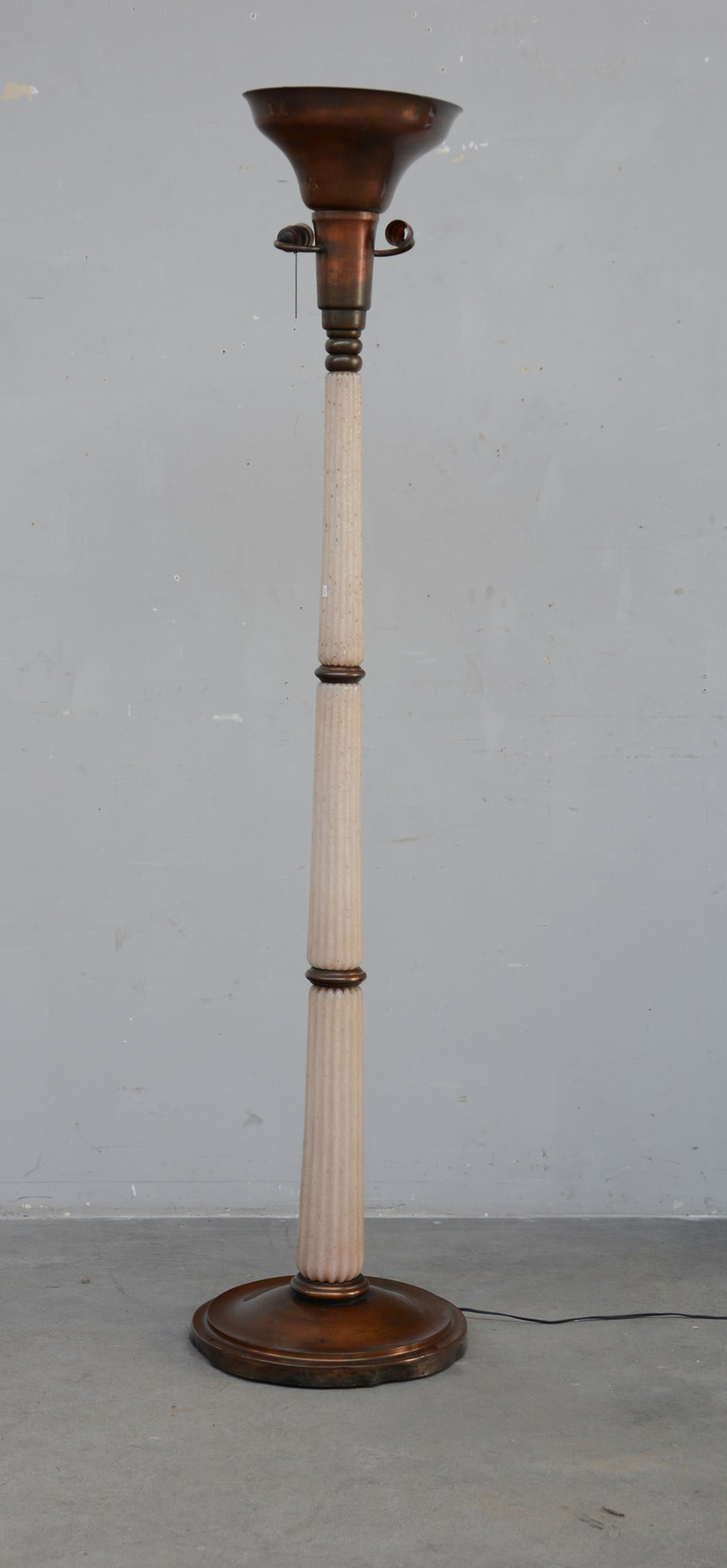 Manifattura di Murano Piantana con fusto in vetro pulegoso, base e ghiere in rame, sec. XX (h cm 184) (difetti)