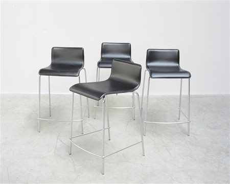 Quattro sgabelli modello "Lilly". Produzione recente Sintesi. Acciaio e cuoio nero (cm 46x77x52) (lievi difetti)