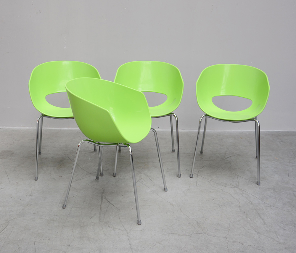 Robby Cantarutti e Francesca Petrichich Lotto composto da quattro poltroncine verdi modello "Orbit". Produzione recente Sintesi. Tecnopolimero standard, tubo d'acciaio (cm 57x81x48)