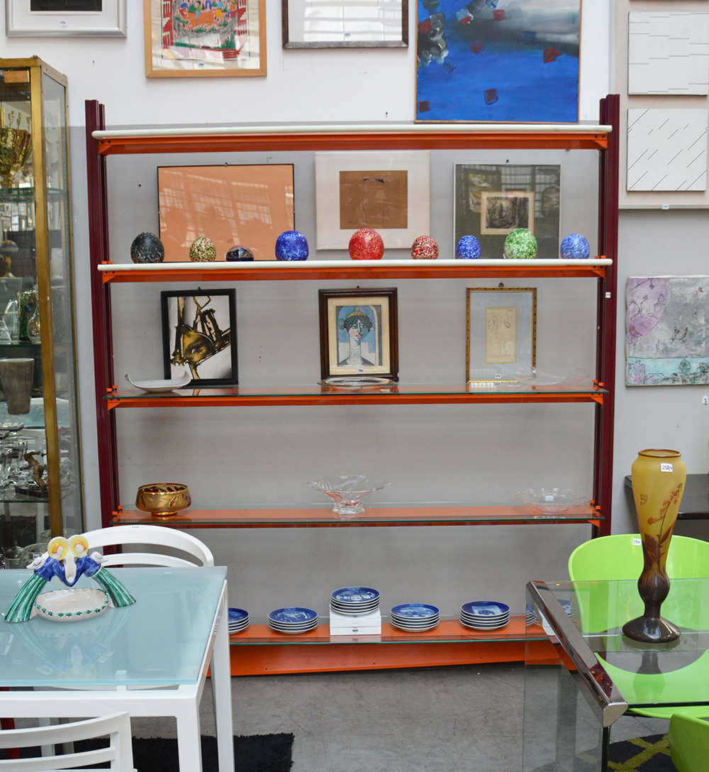 Libreria modello "Kaos R". Produzione recente Driade. Metallo laccato arancione e bordeaux e piani in cristallo (lievi difetti e mancanze)