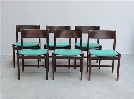 Arne Vodder (1926 - 2009) Lotto composto da sei sedie in palissandro indiano, seduta rivestita in alcantara verde. Produzione Sibast Furniture, Danimarca, anni 60 (cm 51x81x45)(difetti e restauri)