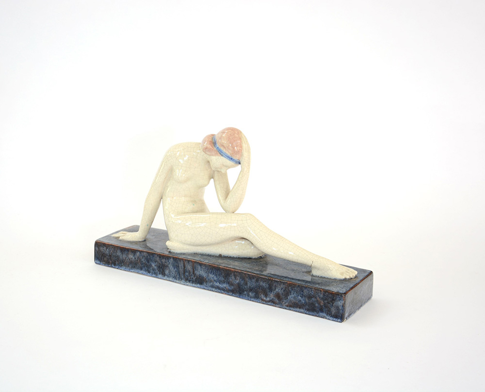 “Nudo femminile”. Scultura in ceramica smaltata in policromia sottovetrina. Firmata alla base “Guero” (cm 45x26) (difetti)