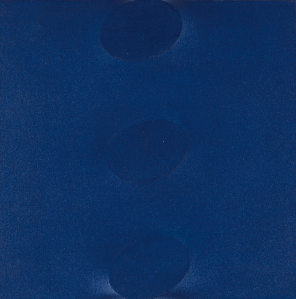 TURI SIMETI Alcamo 05/08/1929 - Tre ovali blu, 2006, tela estroflessa blu cm. 50x50, firma e anno al retro, dichiarazione d'autenticità dell'artista e timbro del Perito Esperto d'Arte Graziano Mele (BA) su foto, pubblicato sul Catalogo Generale, volume I, pagina 192.
