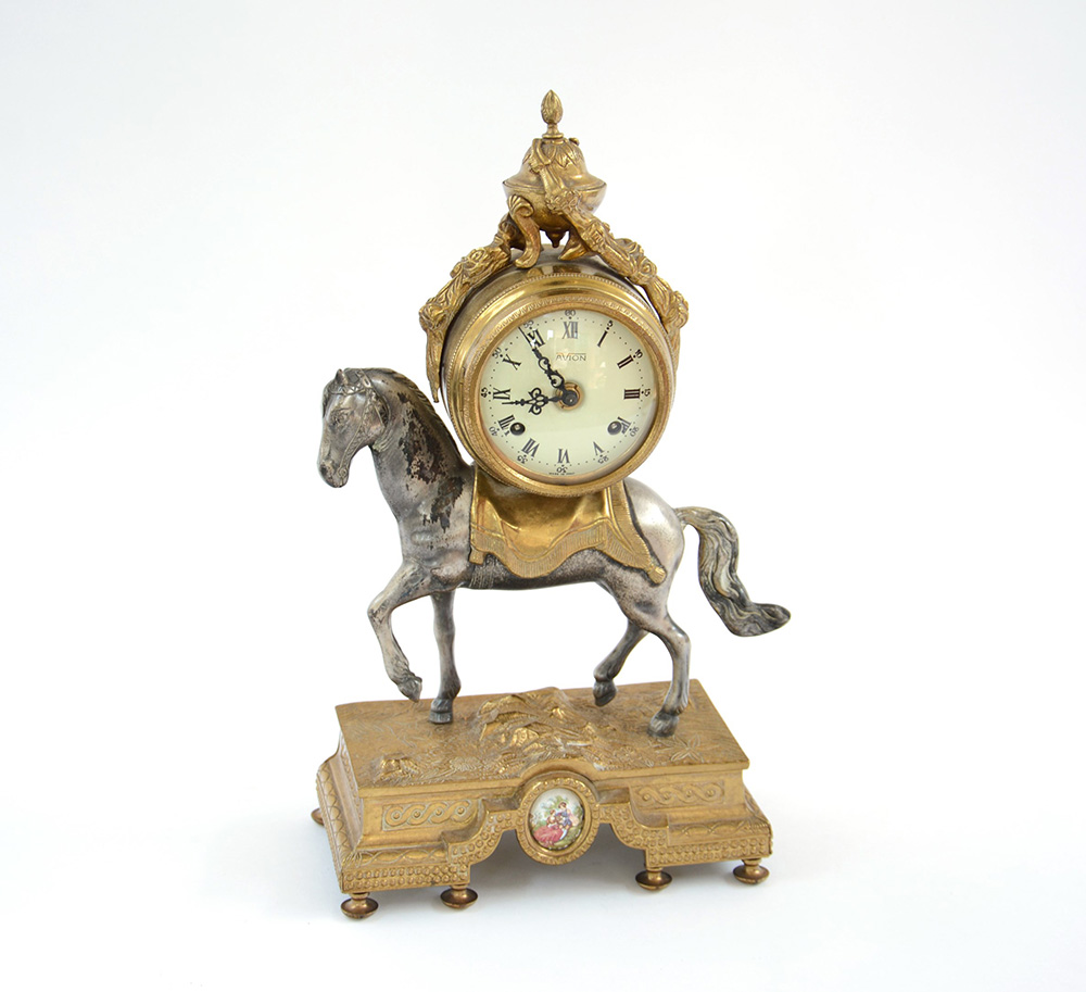 AVION Pendola con cassa in bronzo dorato decorata con cavallo argentato....