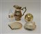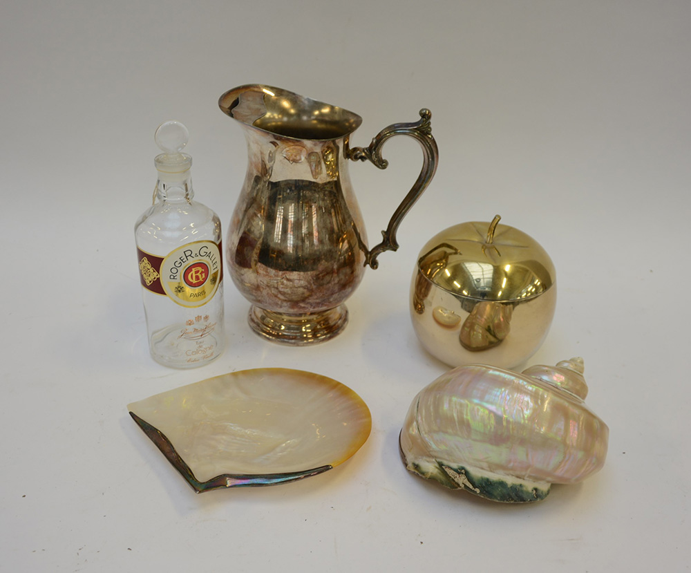 Lotto composto da un versatoio ed un portaghiaccio in metallo, due conchiglie con filettature in argento e una bottiglia porta profumo Roger Gallet