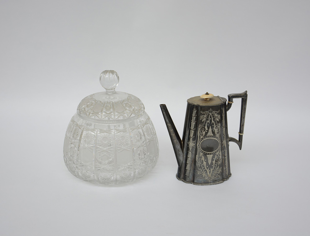Lotto composto da una caffettiera in metallo argentato e una zuppiera in cristallo molato