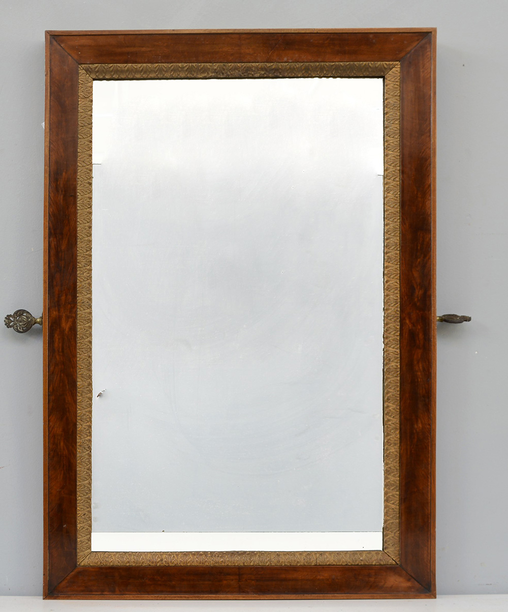 Specchiera da psiche lastronata in noce e decorata all'interno da palmette dorate (cm 66x100) (difetti)
