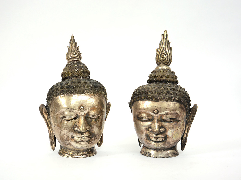 Manifattura orientale. Lotto composto da due teste di buddha in metallo color argento (difetti)