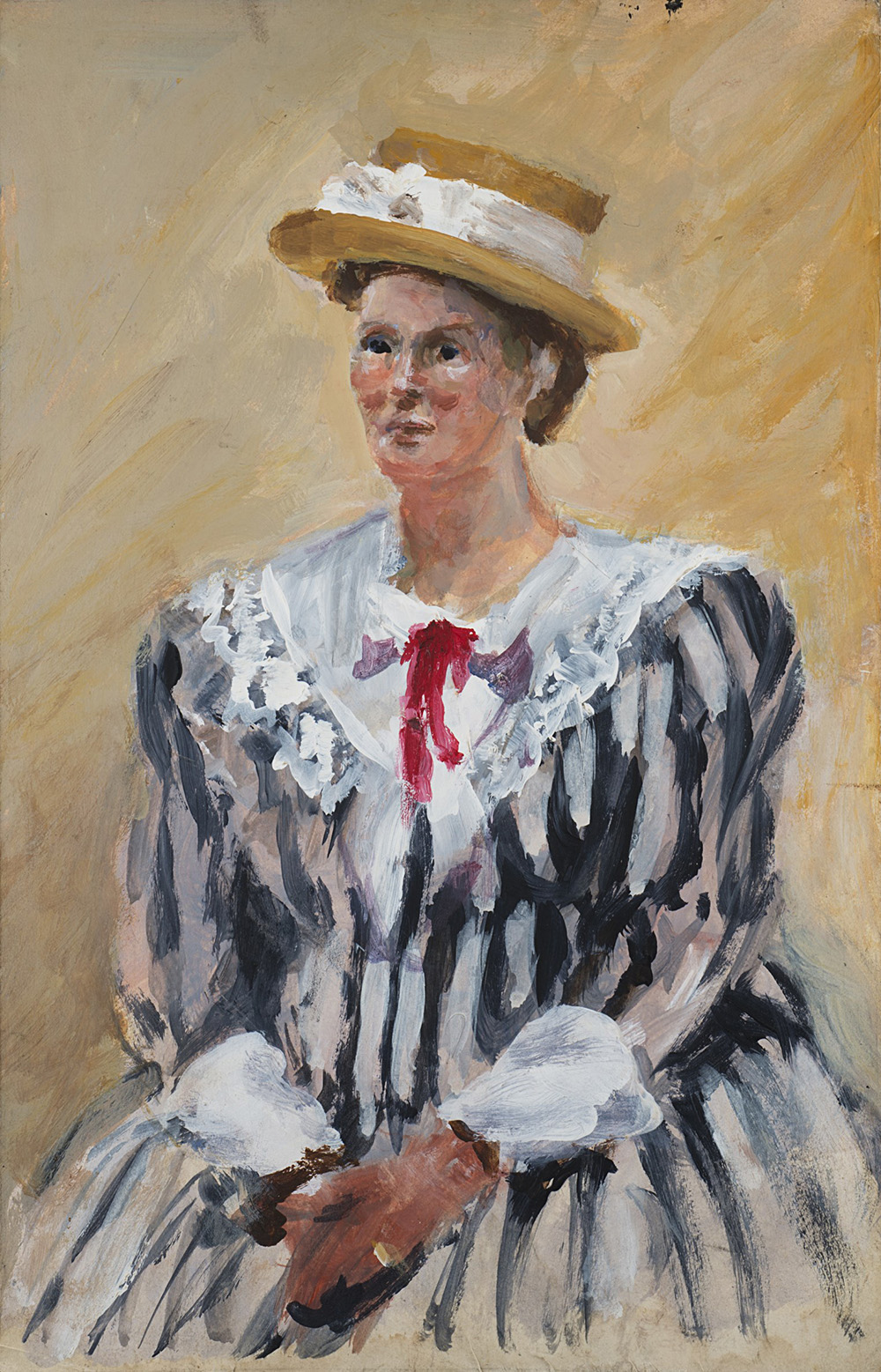 Scuola dell'inizio del sec. XX "Ritratto di donna con cappello di paglia" olio su cartone (cm 36x23) (difetti)