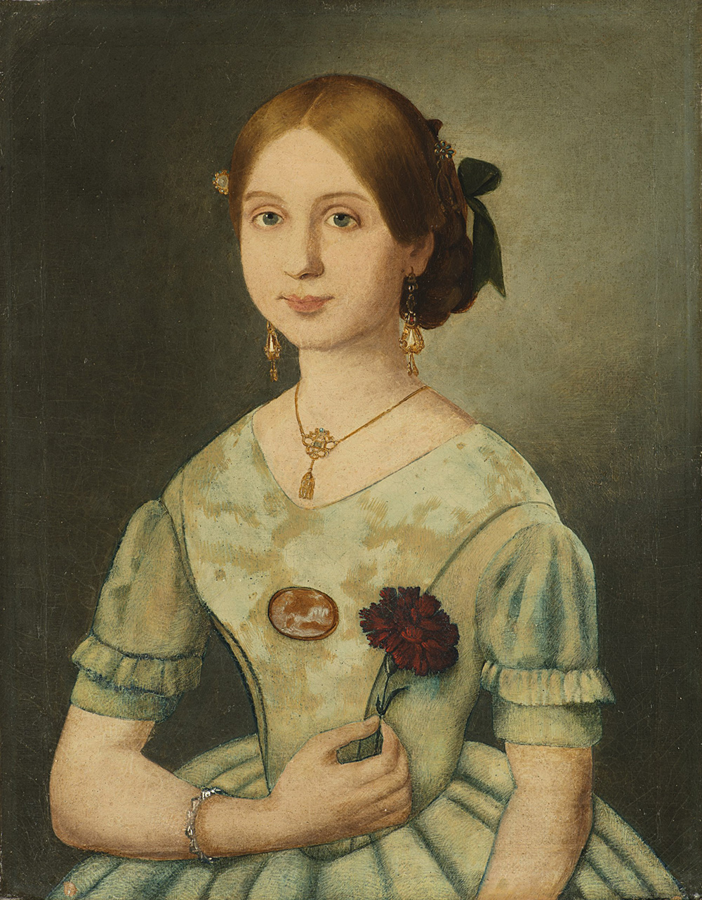Maestro del secolo XIX, "Ritratto di Fanciulla con garofano", olio su tela...