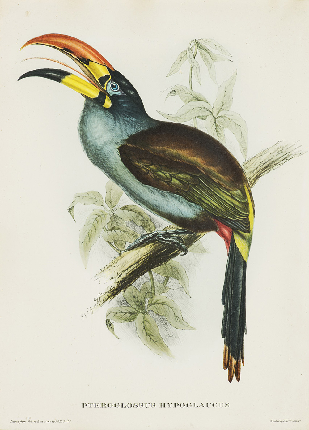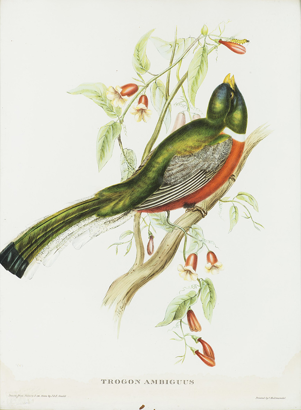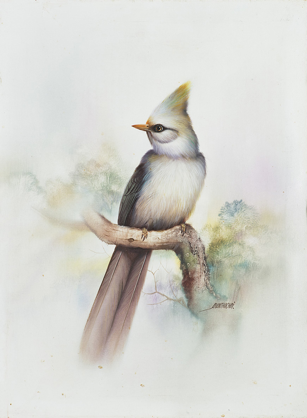 Serie di nove riproduzioni di stampe di Gould con volatili e un dipinto olio su tela firmato Anantachai, di diverse dimensioni. In cornici