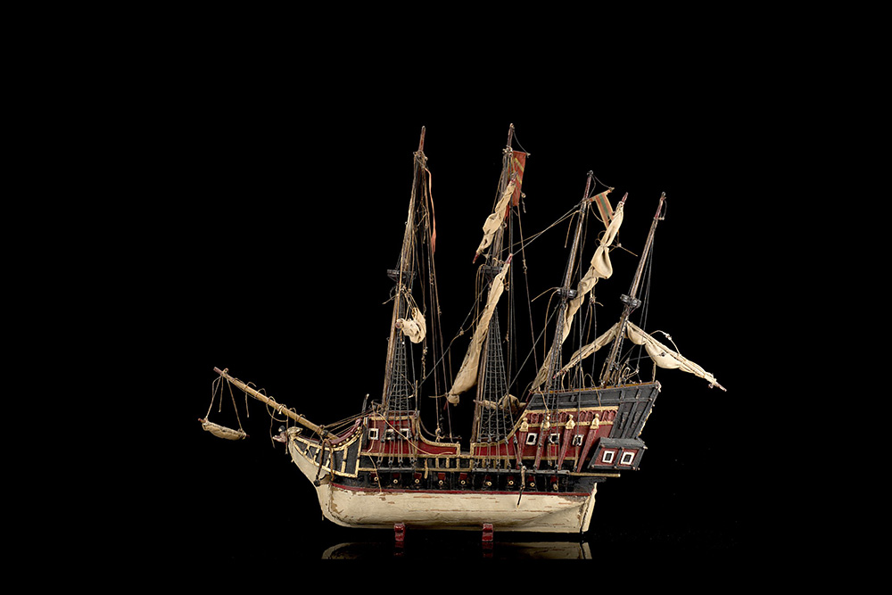 Modellino di veliero a quattro alberi in legno tinto (l.cm 70) (difetti)