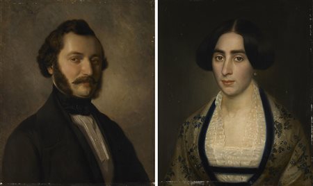 Scuola del sec. XIX "Ritratto di gentiluomo e gentildonna" coppia di olii su...