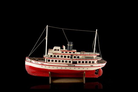 Modello giocattolo di piroscafo in legno smaltato, con basamento (l. cm 67)...