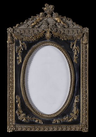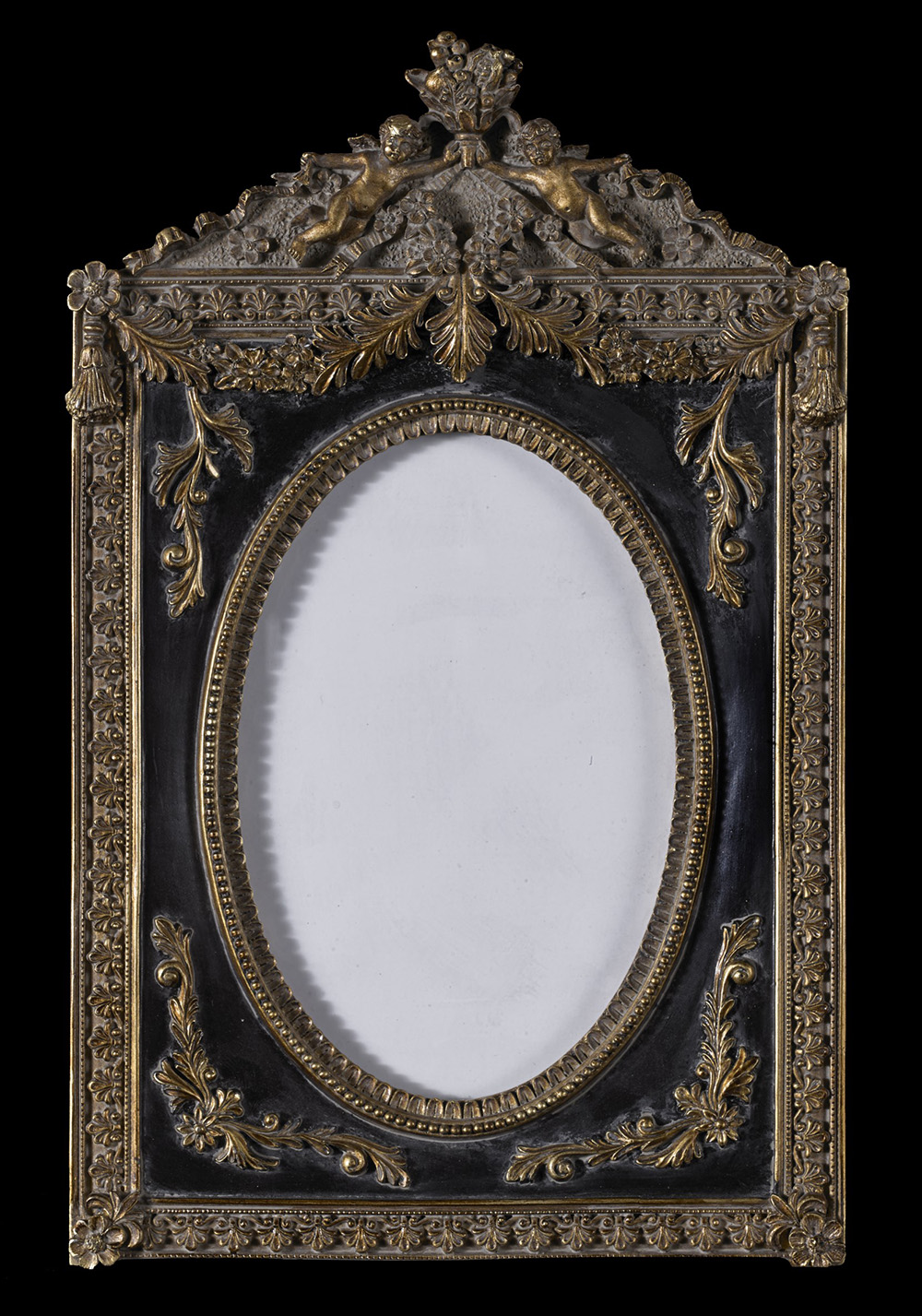 Cornice portafoto sormontata da putti che reggono mazzo di frutta