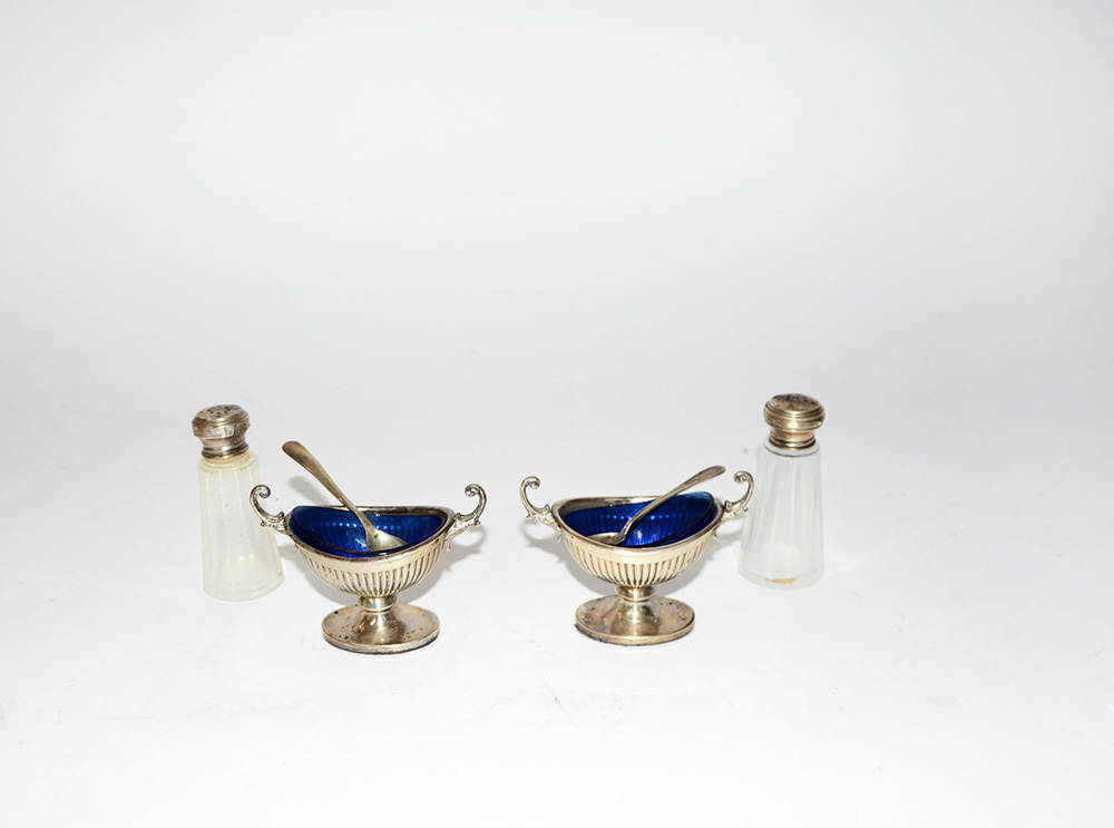 Coppia di saliere in argento in stile impero con vaschette in vetro blu (difetti); unite a due saliere in vetro e argento