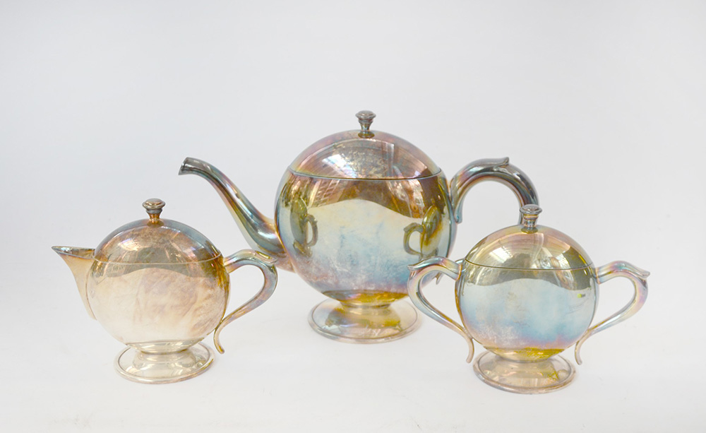 Servizio da te e caffè in argento a corpo liscio composto da teiera, zuccheriera e lattiera