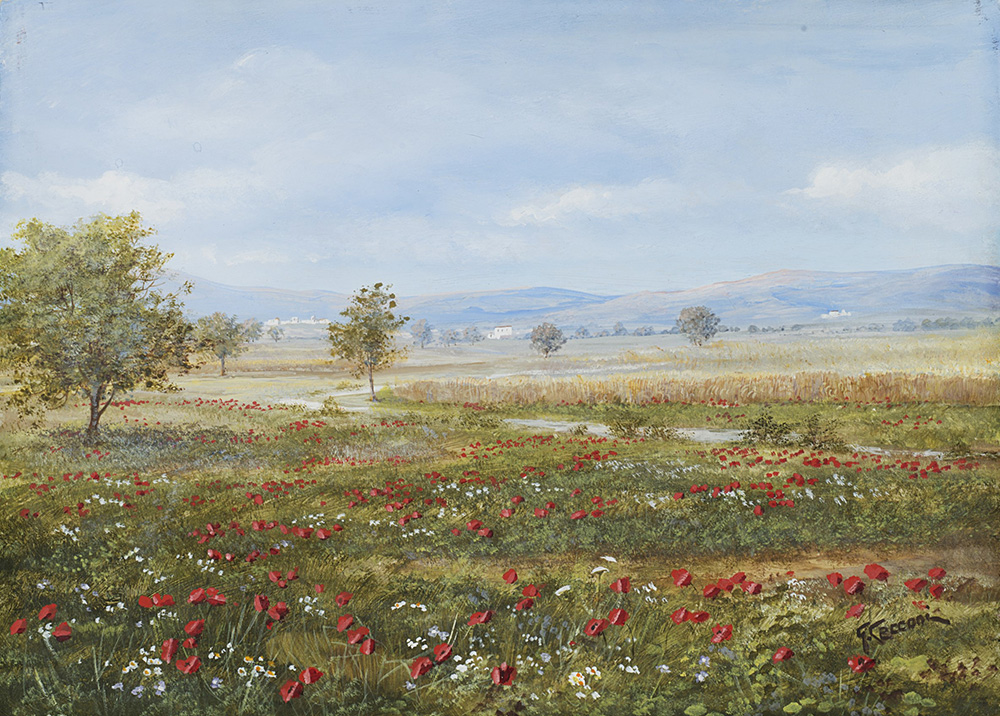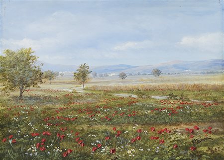 G. Cecconi, inizio sec. XX "Campo di papaveri" olio su carta applicata su cartone (cm 24x33) In cornice (difetti)