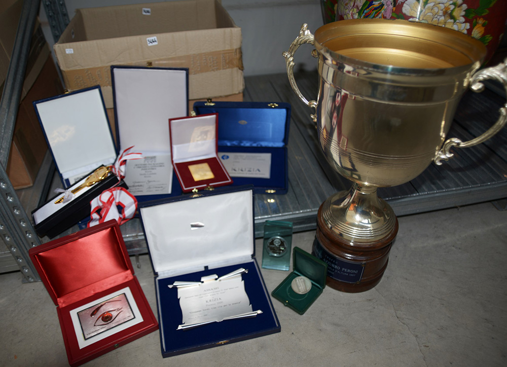 Lotto composto da una coppa e diverse targhe "premio" di materiali e forme diverse, molte in custodia, alcune dedicate a Krizia (difetti)