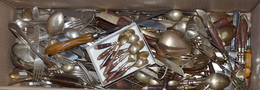 Cartone contenente parte di servizio di posate in metallo argentato e legno (difetti)