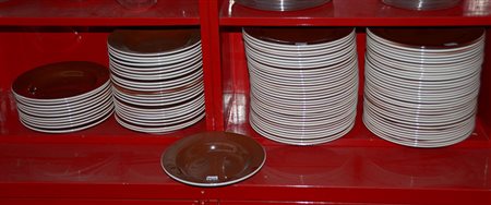 Manifattura Inglese, parte di servizio di piatti in porcellana color bruno composto da 108 pezzi (difetti)