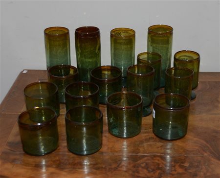 Manifattura di Murano. Parte di servizio da tavola in vetro verde decorato con inclusioni di bolle d'aria. Composto da sei bicchieri da acqua, sei da bibita, cinque bicchieri da vino rosso e cinque da vino bianco (difetti)