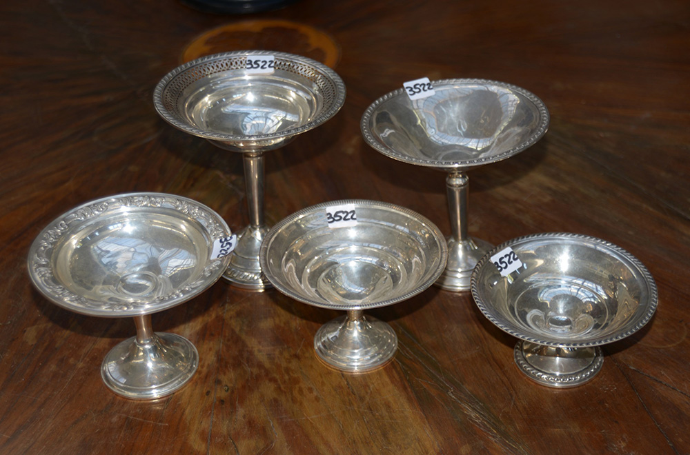 Gruppo di cinque alzatine in lamina d'argento con bordi decorati a palmette e...