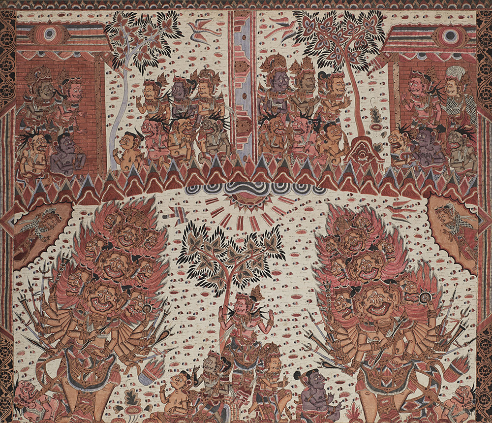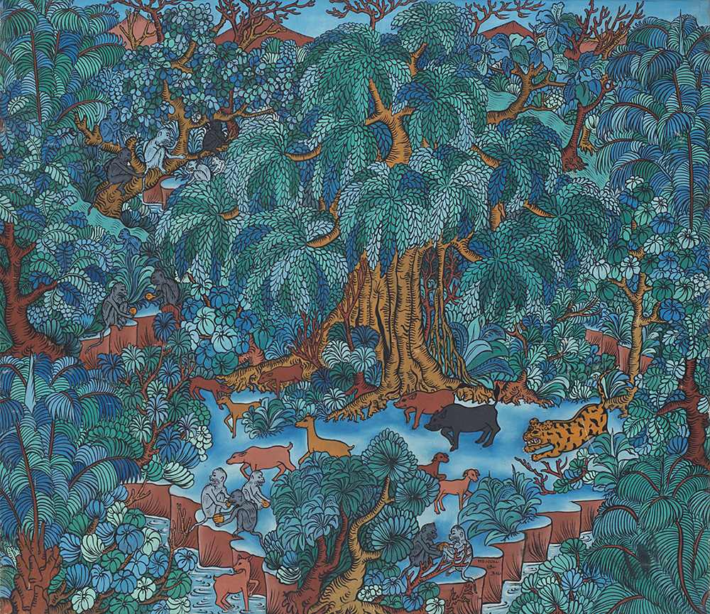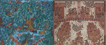 Lotto composto da due dipinti su tela raffigurante demoni e foresta