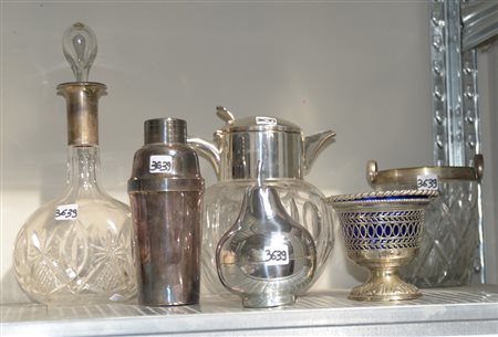 Lotto composto da uno shaker, una zuccheriera, una bottiglia e tre oggetti diversi in vetro e metallo