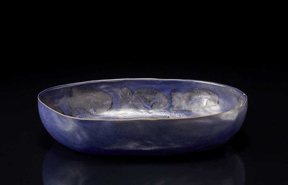 Rosanna Bianchi Piccoli (Milano 1929) (Attribuito) Ciotola in terracotta smaltata a fondo blu decorata con pesci stilizzati. Italia, anni 60 (cm 30x6x20). Monogramma, iniziali e iscrizione indecifrata sotto lo smalto della base (difetti)