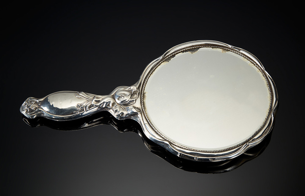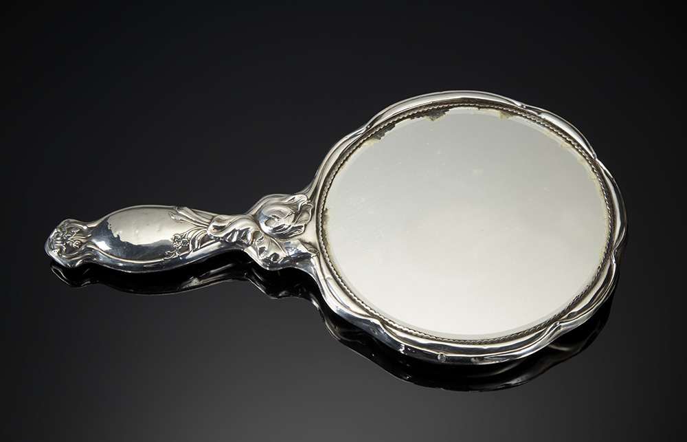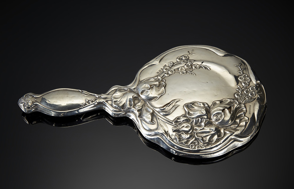 Specchio a mano in argento sbalzato a fiori. Presa mossa. Birmingham, 1907...