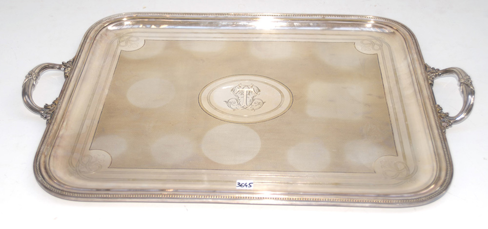 Vassoio biansato in metallo argentato cifrato al centro "T" entro volute. Bordura con perlinature e prese a fiocchi. Christofle, Francia (cm 70) -EN A two-handled silver-plated tray. Christofle, France