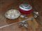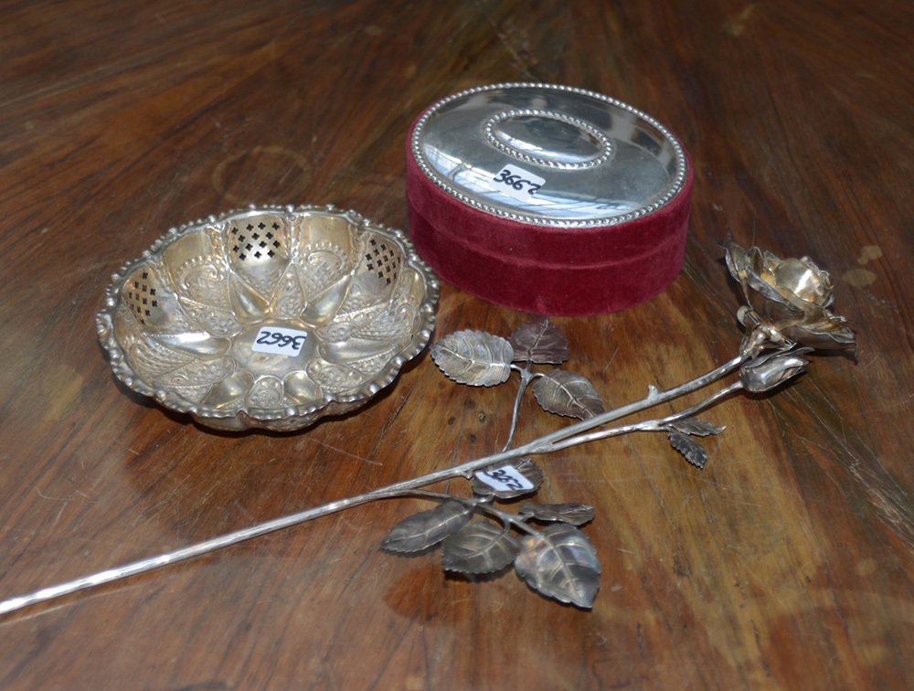 Lotto composto da una scatola in velluto con coperchio rivestito in lamina d'argento, una rosa in argento Brandimarte e una ciotola sagomata e traforata Birmingham 1903 (difetti)