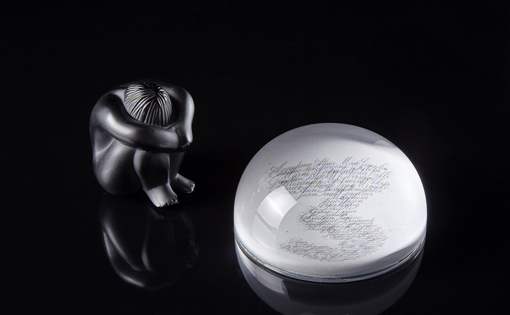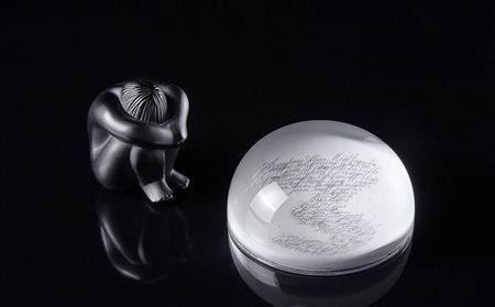 Lotto composto da una sculturina in vetro raffigurante un personaggio accovacciato e un presse-papier di John Derian -EN Lot comprising a small glass sculpture of a crouching person and a paper-weight by John Derian