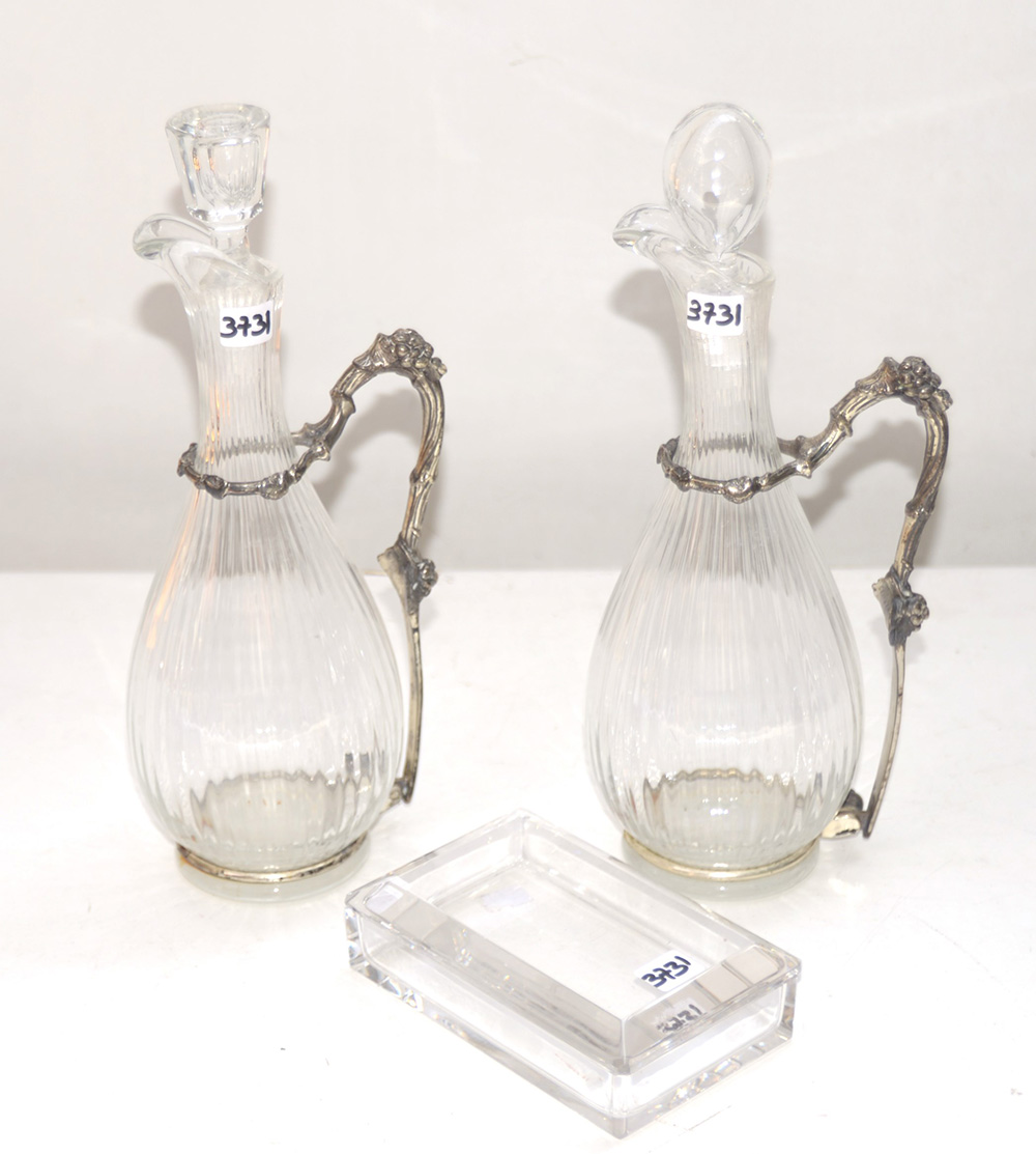 Lotto composto da una scatola in cristallo Val Saint Lambert e due versatoi in vetro con prese in metallo argentato -EN Lot comprising a Val Saint Lambert crystal box and two glass ewers