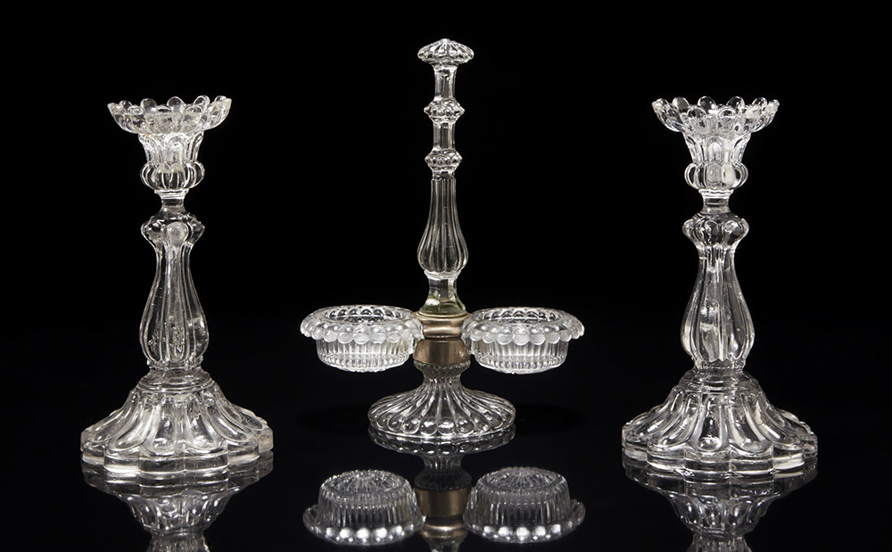 Lotto composto da due candelieri e una saliera in vetro con basi polilobate -EN Lot comprising two candlesticks and a lobed salt cellar