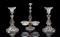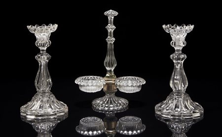 Lotto composto da due candelieri e una saliera in vetro con basi polilobate...