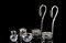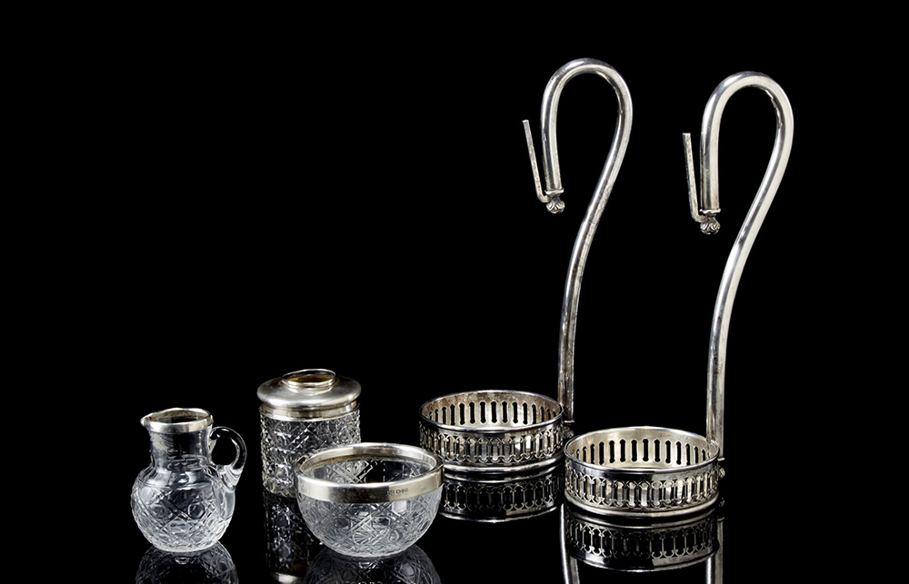 Lotto composto da tre contenitori in cristallo con ghiere in argento e due portabottiglie in metallo argentato -EN Lot comprising three crystal containers and two bottle holders